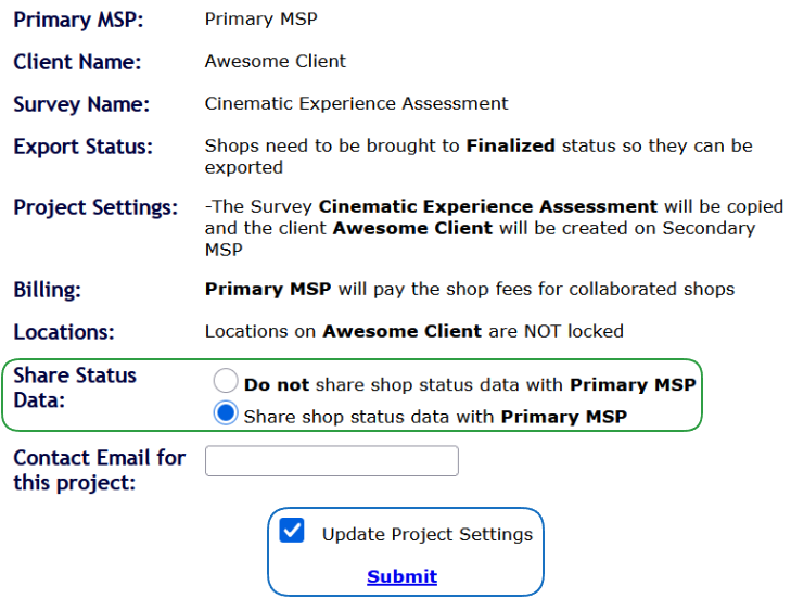 Once the project settings open, look for the Share Status Data setting, and set the radio button to Share shop status data with Primary.